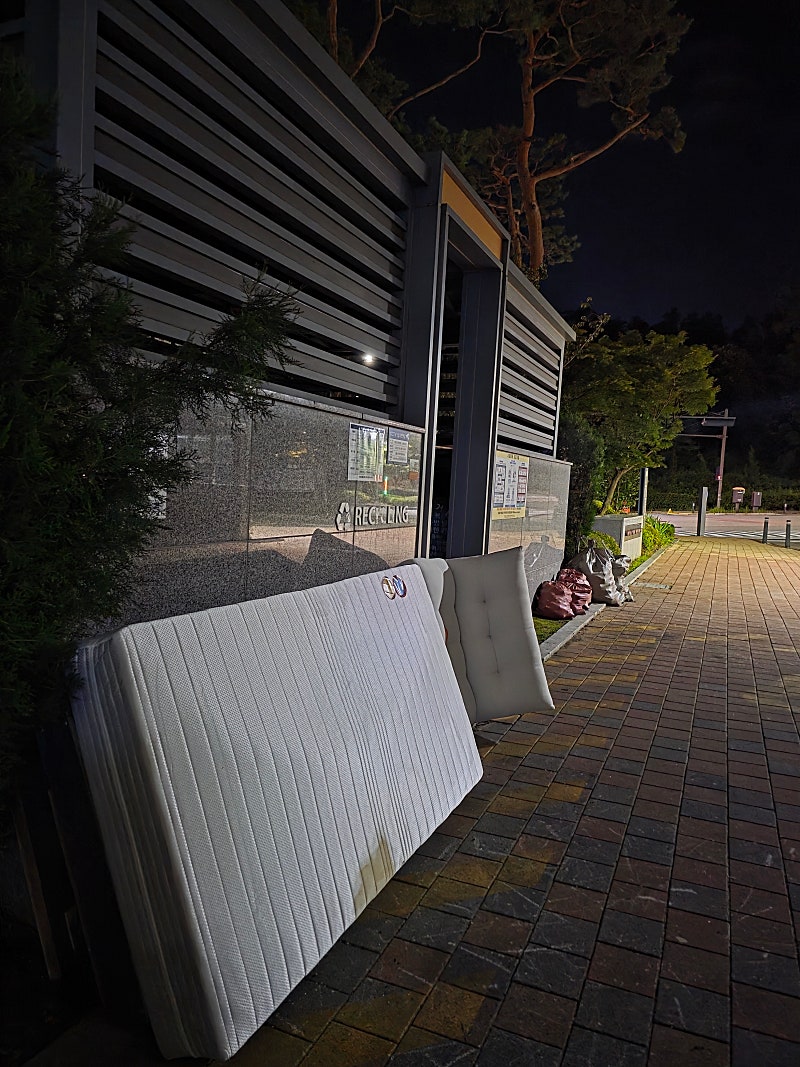 아래 사진은 208동 재활용장 앞에 오늘 저녁에 내어 놓은 침대와 소파 폐기물입니다. 침대 프레임도 매트리스 뒤에 있습니다. 총 17.000원 가량의 스티커가 붙어있습니다. 오늘 수거해 갔으니 저 상태로 다음주 화요일까지 있어야 합니다. 비와 눈이 와도 저대로 방치됩니다. 보기 좋으신가요?