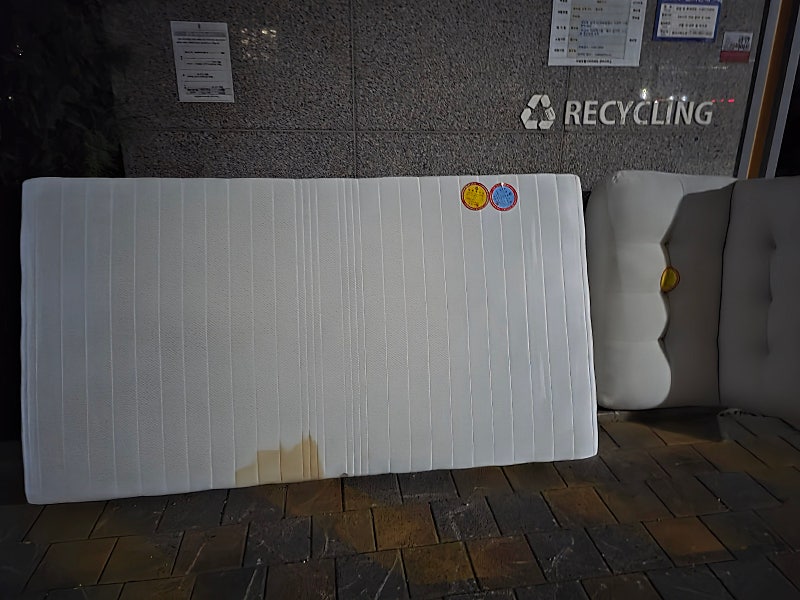 특히 매트리스에 붙어 있는 스티커는 떼기도 쉽고 비가 오면 그대로 떨어집니다. 이련 현상은 비단 208동 뿐만이 아닙니다.